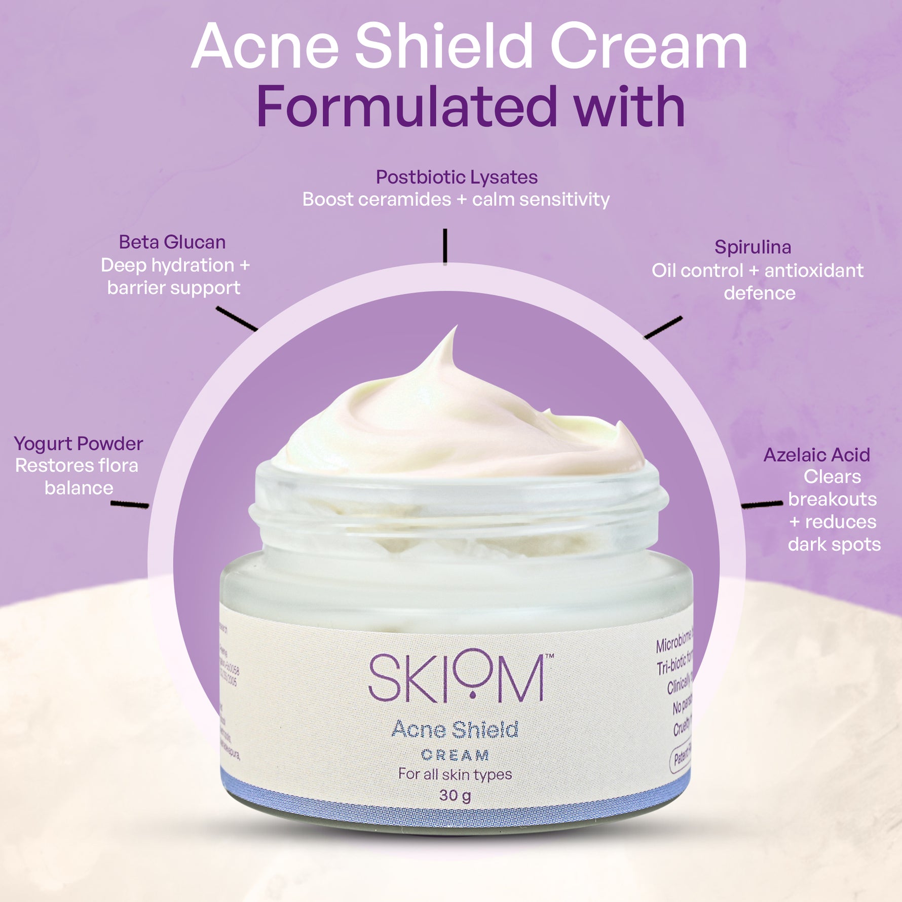 Your skin is home to billions of beneficial bacteria, the microbiome that protects, heals, and renews. When this balance is disrupted, acne and breakouts can take hold. Skiom Acne Shield Cream is created to restore that balance by working with your skin’s natural ecosystem rather than against it.